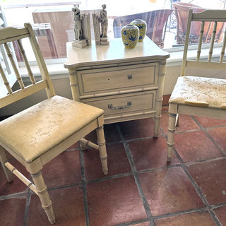 Henry Link faux bamboo Hollywood Regency Crest dresser (6 drawers) with hutch (3 small drawers + 2 shelves), plus 2 chairs and side table/nightstand